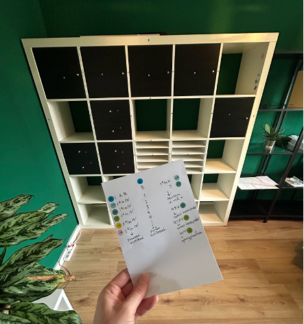 Dit keer besloot ik het anders aan te pakken. Ik plakte gekleurde stickers met cijfers en letters op de planken en de bijbehorende deuren en lades. En weet je wat? Het werkte perfect! Geen urenlang gepuzzel meer :)