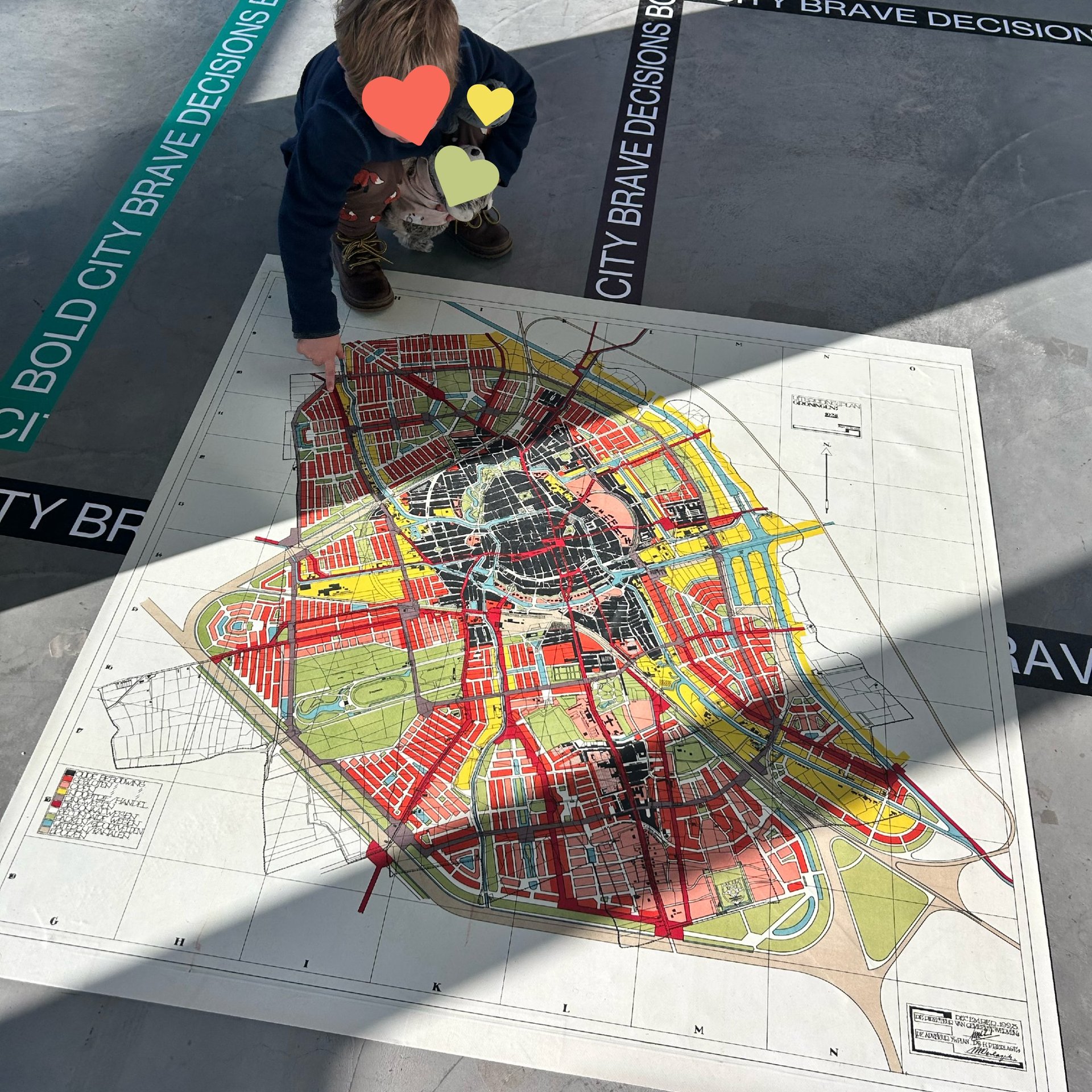 Afgelopen vrijdag was ik met mijn neefje (3 jaar) in de Lochal in Tilburg. Helemaal bovenin het gebouw bevond zich de tentoonstelling 'Bold City, Brave Decisions', waarbij een plattegrond van de stadsontwikkeling van Groningen uit 1928 te zien was, gedrukt op de vloer. Een prachtig stukje cartografie!
